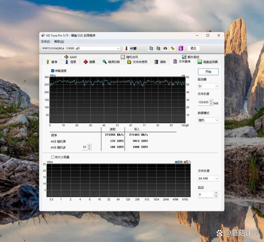 最后跑个文件基准测试,测试文件大小100GB,读取和写入速度都挺不错的,在270MB/s左右波动。