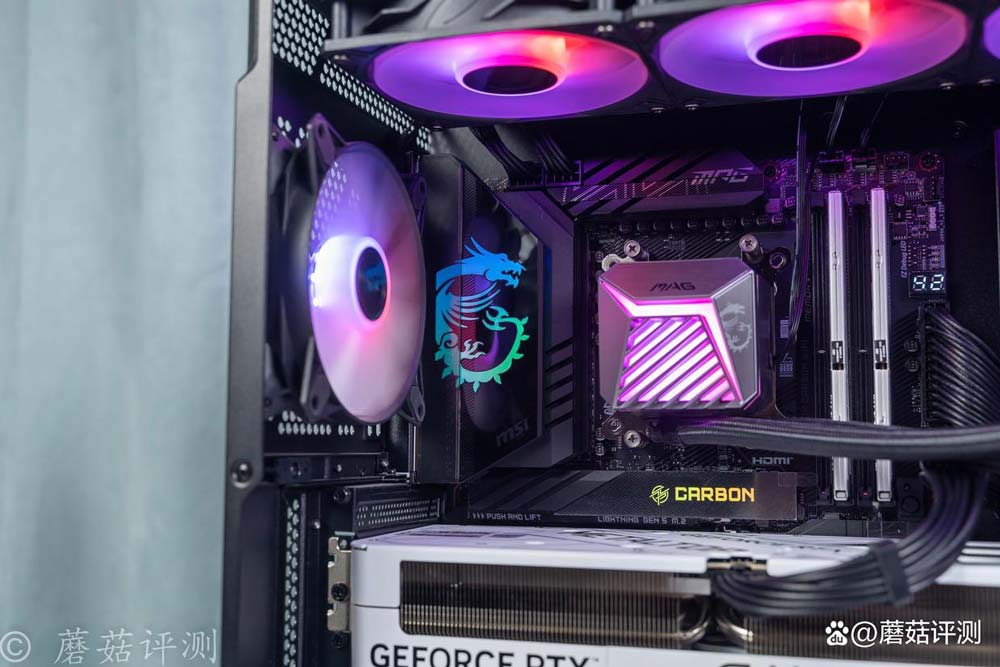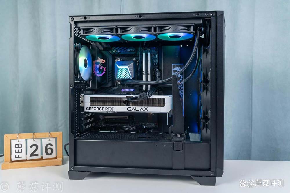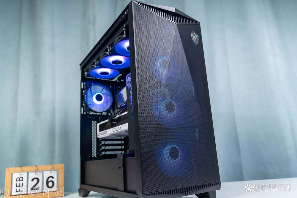 机箱是微星的氪金枪3,这款机箱前部有超大面积的金属冲孔网,标配4把支持ARGB灯效的机箱风扇,颜值很漂亮。