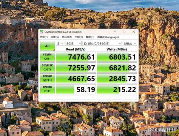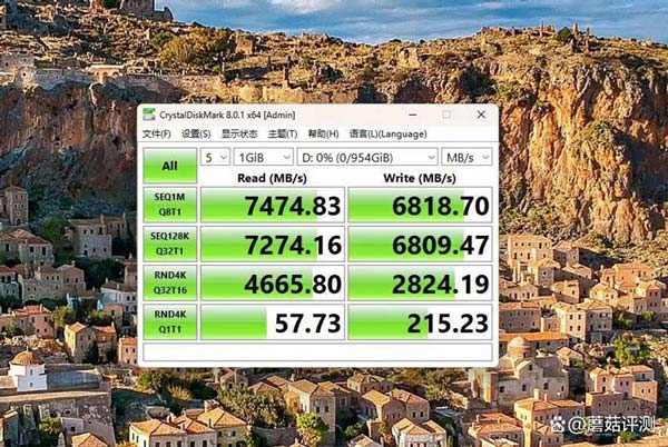 换DiskMark跑测试,测试文件大小1GB,顺序读取速度在7474MB/s、写入速度6818MB/s,轻松超过标称速度。4K读取速度在57MB/s、写入速度在215MB/s,表现不错。