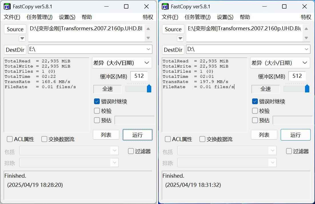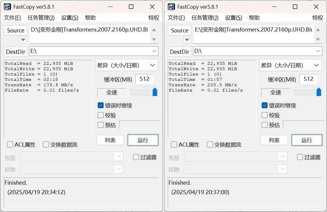 我们用Fast Copy实测文件的拷贝速度,从SSD里拷贝一部22GB的高清电影到SD卡里,耗时大约2分18秒,平均传输速度173MB/s;从SD卡拷贝回SSD里,耗时大约1分57秒,平均传输速度206MB/s。