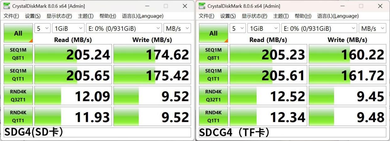 首先是CDM的测试,两张卡的读取速度基本一致,都在205MB/s,而写入速度则是SDG4(SD卡)要略高一些,达到了175MB/s,SDCG4(TF卡)的写入速度是160MB/s。两张卡的读写速度均达到甚至略超过标称值,也远远超过V30的速度等级,但因为这张卡是UHS-I接口,在不同相机的机内速度可能会有较大差异,建议还是以V30作为速度参考标准。