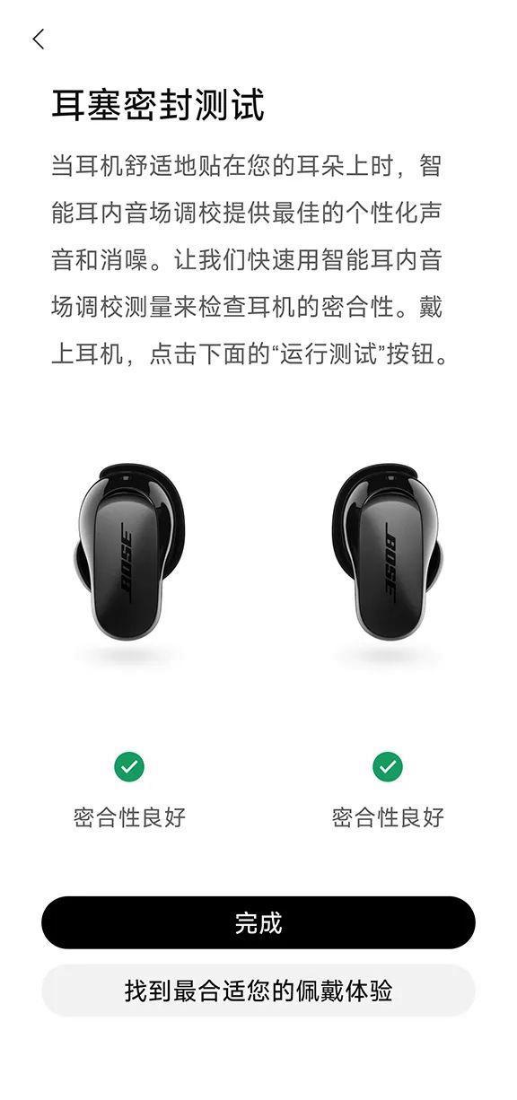将耳塞放入耳朵后,来回旋转即可佩戴到位。我尝试了几种耳塞套与稳固环的组合,最终还是换回默认的M耳塞套和1号稳固环。Bose App还提供了“耳塞密封测试”,通过播放特定音频检测耳塞密合度。若检测结果为“密封性良好”,则代表符合要求;若显示“调整获取更好的密合性”,用户就需要通过调整佩戴方式或更换耳塞套、稳固环进行优化。App中的使用指南以动态演示配合文字说明,为用户提供了直观的操作指引。