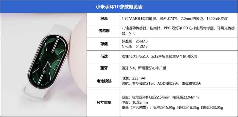 小米手环10 NFC版本的整机重量在16.25g,虽然比上一代略中一点,但更大更亮的屏幕、升级的九轴传感器和线性马达2.0,在功能体验上实现了显著提升。