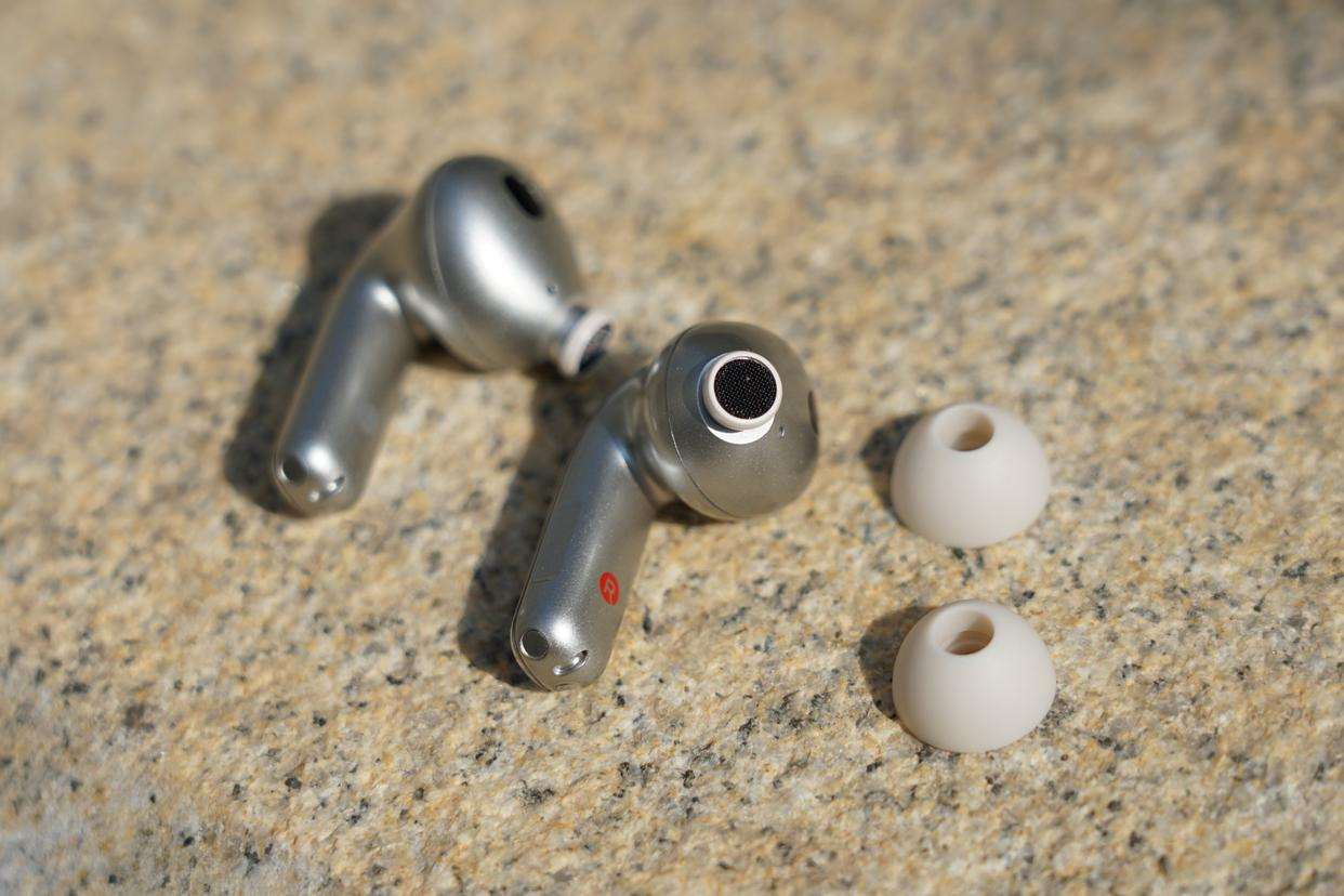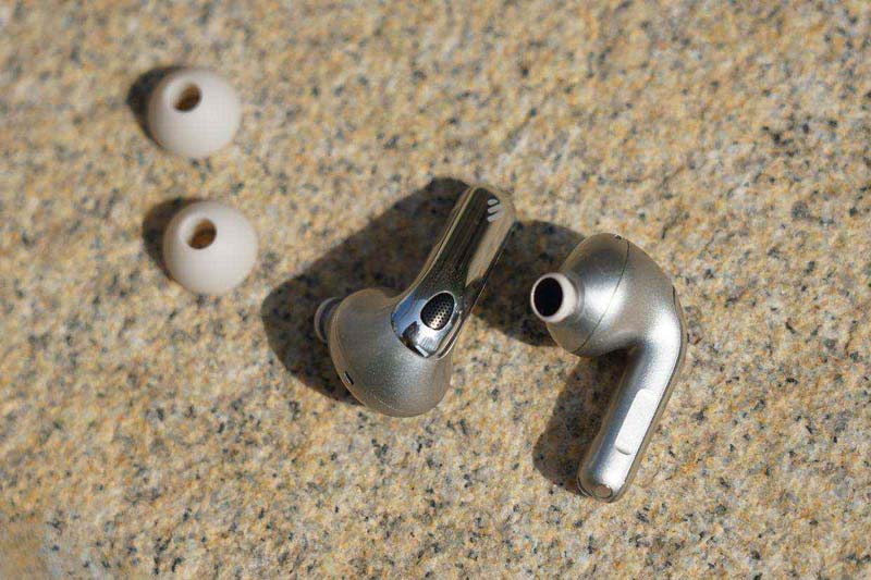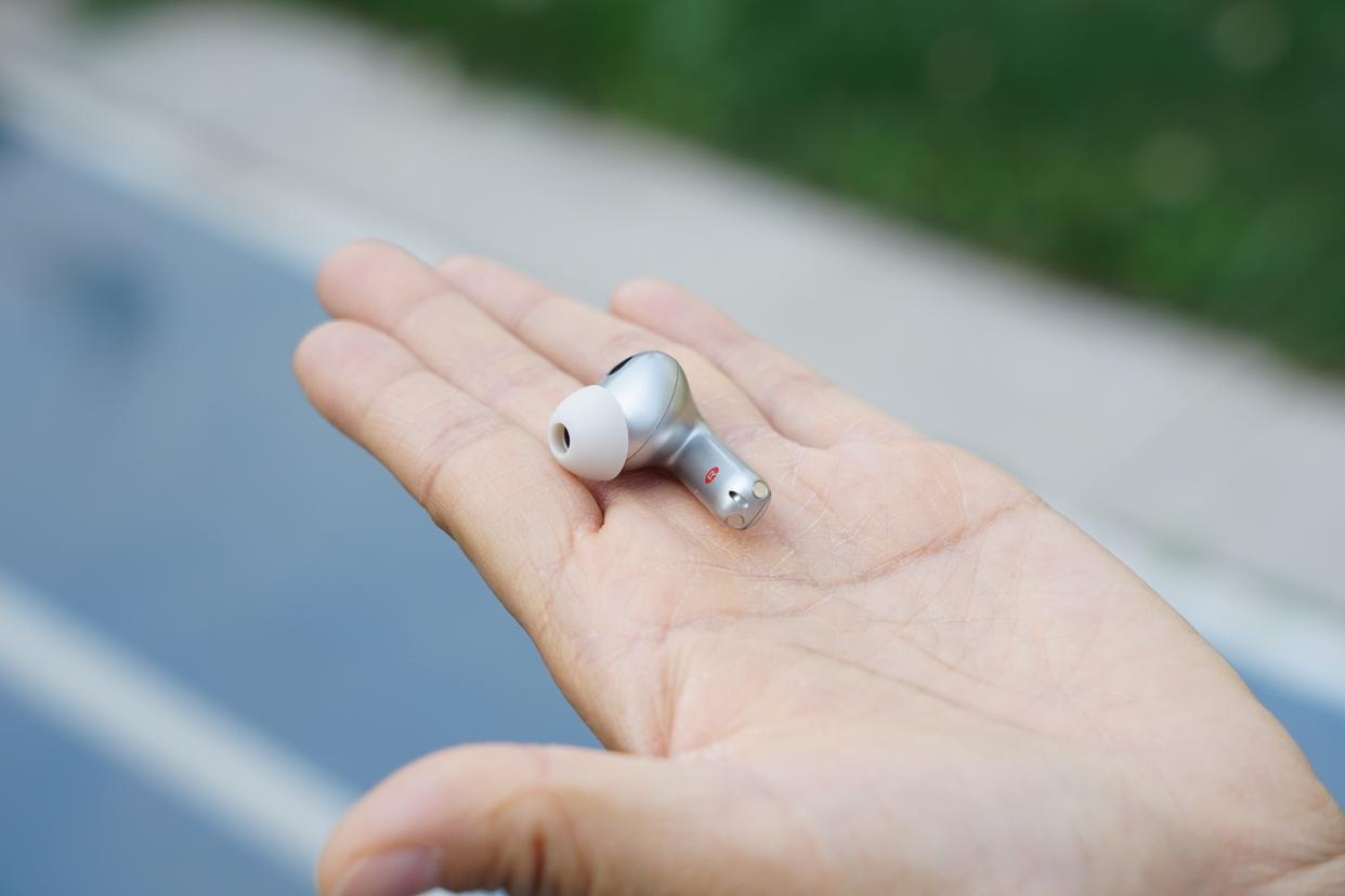 作为降噪耳机其采用三麦克风拾音设计,分别在单元顶部、单元背部以及耳机短柄底部,多方向分布,检测环境音也更灵敏。并且在耳机短柄触摸操控区域还做了一个手指能感知的平面切割设计,更方便盲操作。