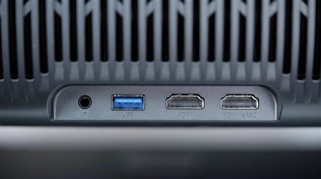 尾部的接口特写,3.5mm音频输出接口、USB 3.0接口以及2个HDMI 2.1接口。