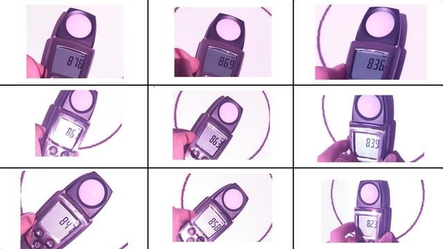 测试前将投影仪重置到出厂默认值状态,输入与投影仪固有分辨率一致的白场信号运行半小时以上时间,使其工作状态趋于稳定,将白场色温设定在6000K-10000K之间,然后使用TESTO540照度计测试如上图所示9个点位的照度值。