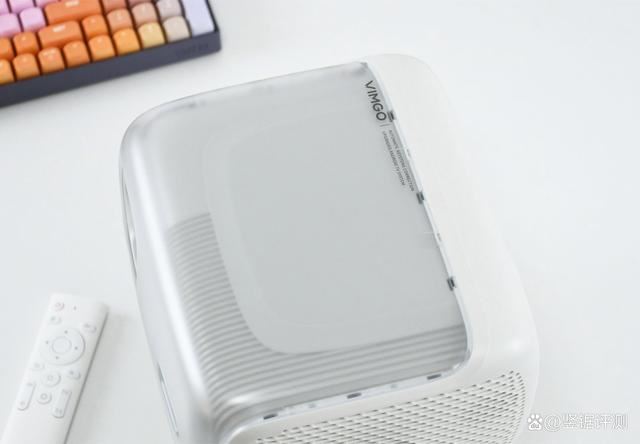 以往评测智能投影仪的时候,我都不会对其外观大肆点评,但微果V7 Plus的外观设计还是有蛮多能说的地方。首先整机并不是单独的纯色,而是采用了透明以及白色的“双拼设计”,个人感觉挺好看的,这种外观设计也能够更好的融入家居环境。