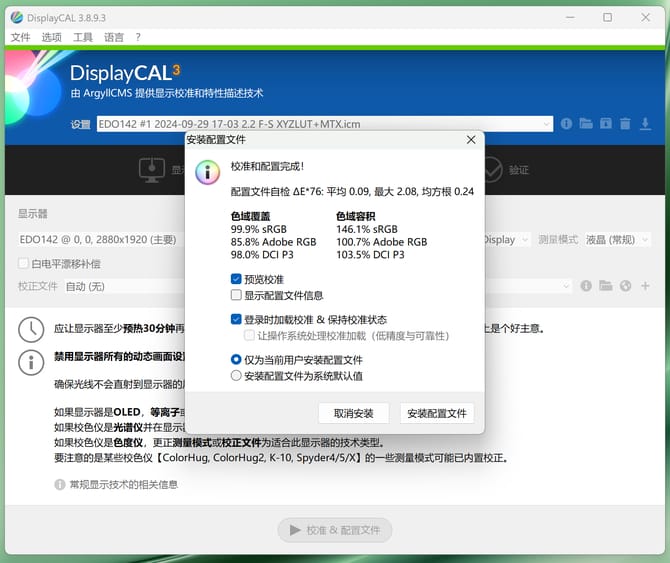 在使用爱色丽 i1 display 校色仪实测屏幕的色域,可以看到色域覆盖99.9% sRGB,色域容积146.1% sRGB,可以满足创作设计对屏幕色彩的需求,相当优秀了。