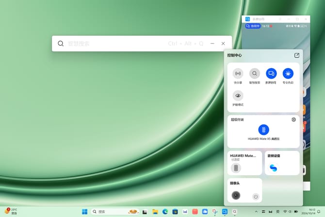 随着工作的移动多元化,手机和电脑作为移动办公的工具,经常要互相传递文件和协同,Hi MateBook 14在这方面的表现非常出色。此时我们只需在Hi MateBook 14 的系统任务托盘点击「控制中心」,就会弹出对话框,在开启「超级终端」后,即可在PC屏幕上显示手机的界面,并进行多样协同操作。此外,在「控制中心」里还有快分享、智慧搜索、多屏协同、专业色彩、护眼模式等快捷功能,以及更加个性化的AI摄像头、AI语音等进一步提升工作效率与便捷性。
