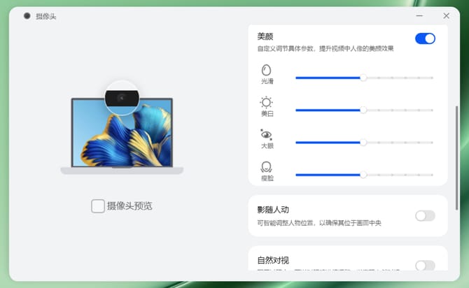 想要在镜头里表现完 美的自己,还可以开启自定义美颜功能,包括美白、大眼、瘦脸等。此外还有影随人动、自然对视等的功能,有兴趣的不妨亲自试试。