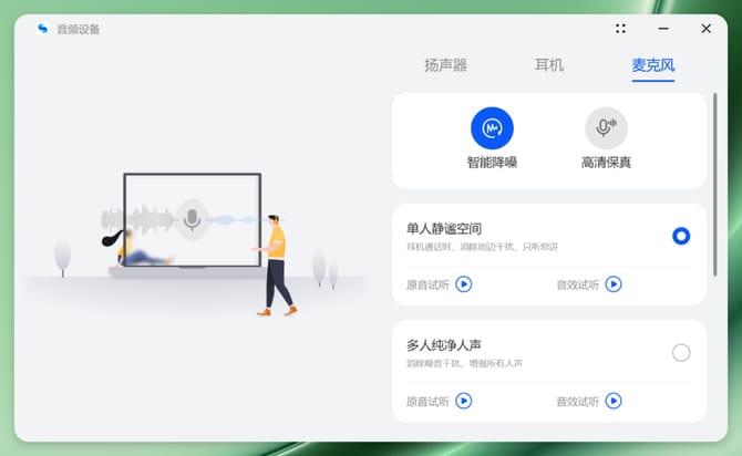 针对不同的通话场景,在麦克风的选项里还有“智能降噪”和“高保真”两个设置,如果所处的环境比较嘈杂,可以选择智能降噪,然后再选择单人静谧空间或多人纯净人声,能有效抑制周围环境噪音,通话的双方均能获得更清晰的语音。