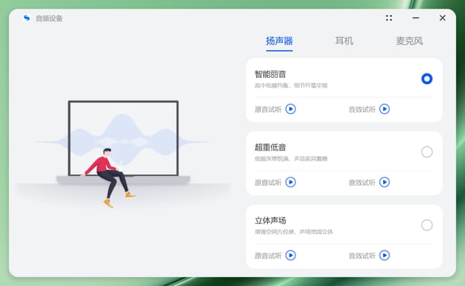 Hi MateBook 14 可以说把音画都做到了极 致,除了视觉优化,在音频设备里,也有非常丰富的功能设置。在这里可以对扬声器、耳机、麦克风设备进行详细的设置,以达到更优秀的听感。