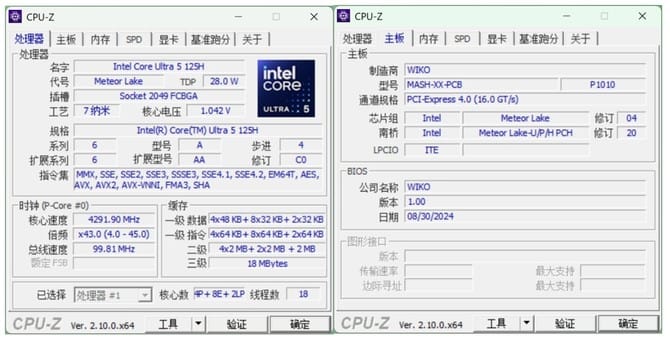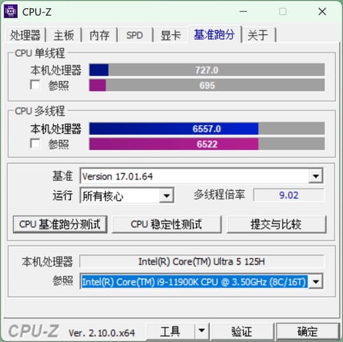 CPU-Z软件除了可以检测CPU、主板、内存等的信息,还内置了CPU的基准测试跑分选项,结果可见,酷睿Ultra 5 125H 处理器的单线程得分为 727 ,多线程得分为6557,对比内置的处理器,高于酷睿i9-11900K,这可是当年台式机的高端CPU型号了,所以,全新的酷睿Ultra处理器,在性能上满足办公、学习等的应用流畅运行,是毫无压力的。