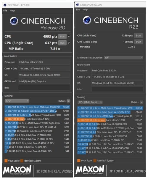 CineBench是测试处理器性能常用的软件之一,其使用针对电影电视行业开发的Cinema 4D特效软件引擎,可以测试CPU和显卡的性能。测试结果可见,CINEBENCH R20测试的单核得分为 637 pts,多核得分 4993 pts;CineBench R23测试单核得分1650 pts,多核得分 12859 pts。