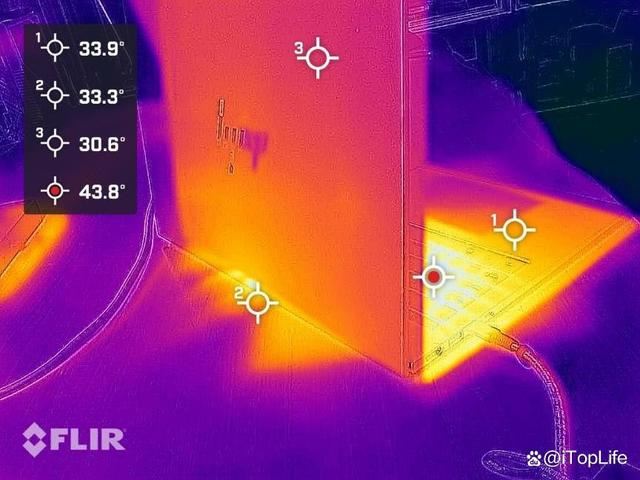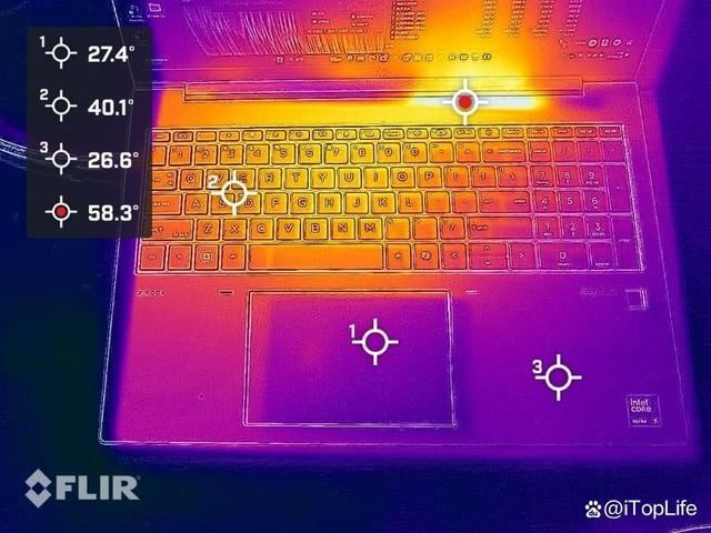 例如在红外测温下,可以看到热量集中在屏幕下方,对键盘、触控板和掌托都不会造成使用体验的影响。
