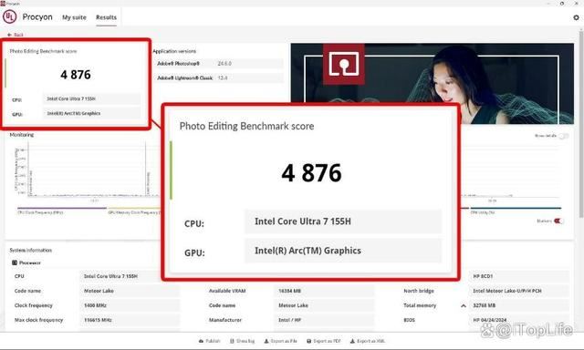 这里引用Procyon中对Video Editing和Photo Editing进行的测试,在频率和功耗的限制下,惠普战X16也已经获得了不错的性能水准,相对于满性能释放的Intel Core Ultra 9的核显大概在7%到25%之间。