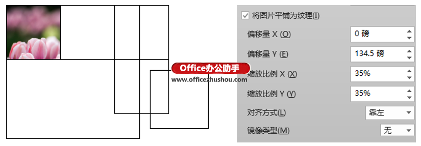 3、勾选“将图片平铺为纹理”,并根据实际情况调节“设置形状格式”窗口中的偏移量、缩放比例等参数。注意:如果要保证图片不变形,缩放比例X和缩放比例Y要保持一致。