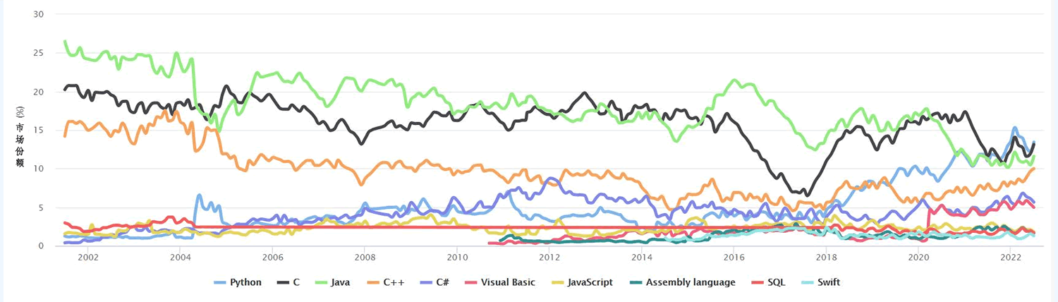 最后,我们不妨再看一下 Python 历年来的市场份额变化曲线(浅蓝色曲线表示 Python)。