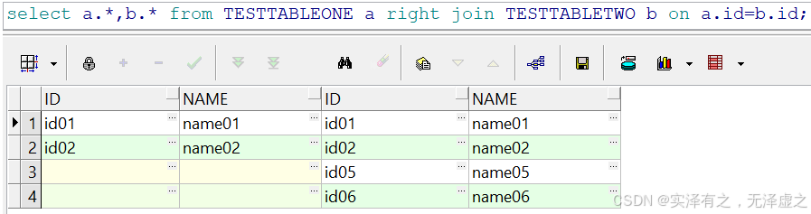 右表(b表)返回全部4条数据,左表(a表)只返回了id01和id02,对于右表存在而左表不存在的id05和id06两条数据,右表返回全部数据,而左表则返回NULL。
