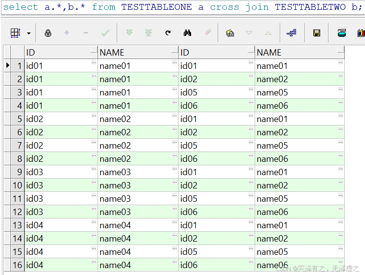 总共返回16条数据,即左表4条数据乘以右表4条数据。