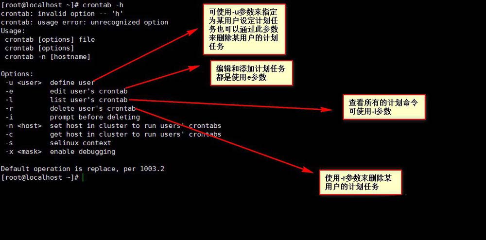 4、crond服务提供crontab命令设置计划任务,crontab命令可通过-h命令来查看一些参数信息