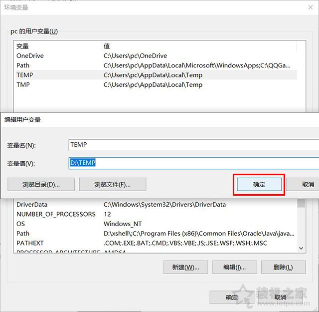 将TEMP和和TMP两个变量的路径修改为D盘、E盘、F盘等容量比较大的硬盘。双击“TEMP”变量,再点击“浏览目录”。