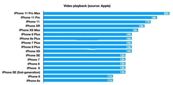 苹果对不同机型间续航时间量化,是以视频播放时长为标准,那么SE2 能达到哪种时长?看看下表是不是很清晰了。
