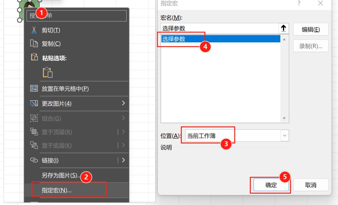 单击【图片】,鼠标右键,选择【指定宏】,位置【当前工作簿】,【选择参数】,单击【确定】按钮。