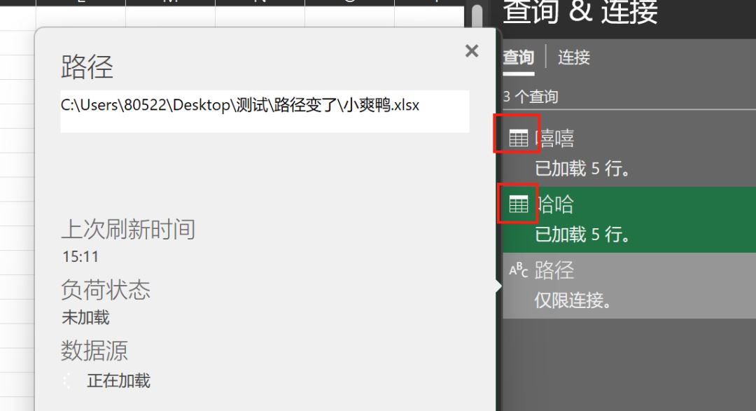现在,我们来做一个测试,案例中我已经事先导入测试文件夹中小爽鸭的 Excel 文件,文件路径都引用了路径参数(此时数据源路径是存在的)。