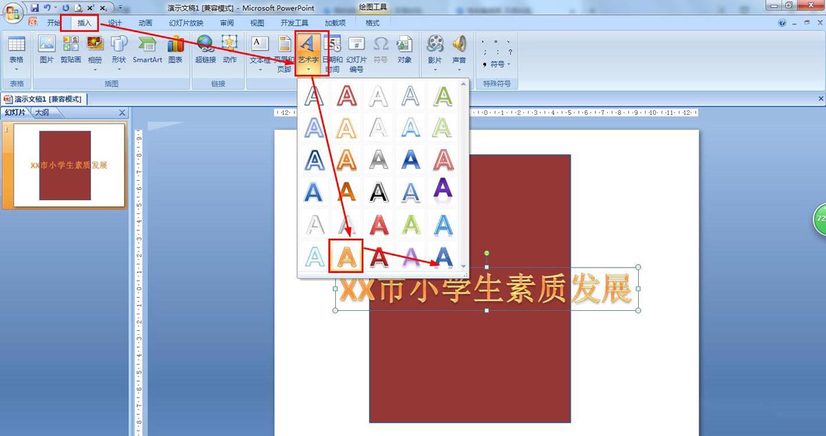 点击插入——艺术字——选择:填充,强调文字颜色6——然后输入:XX市小学生素质发展