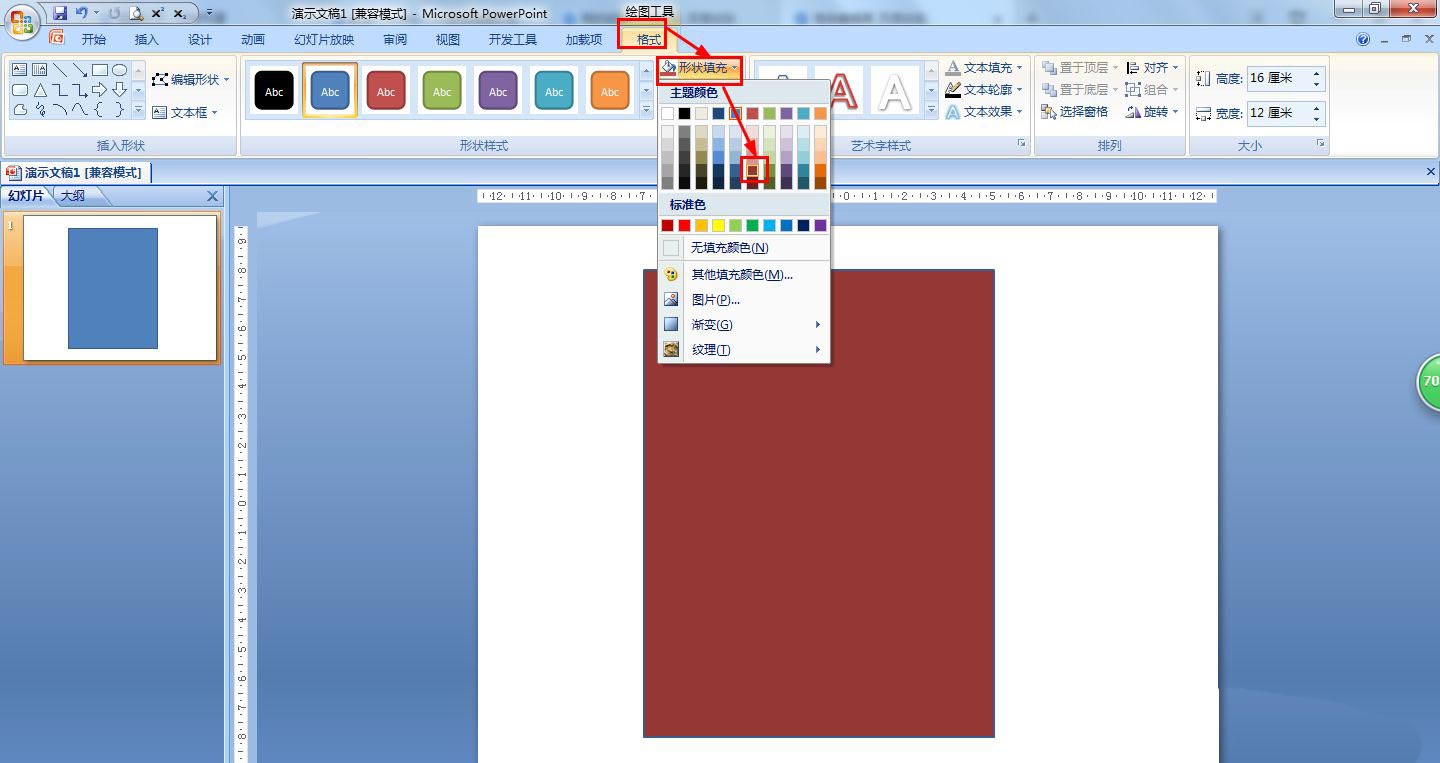 点击格式——形状填充——选择:红色,强调文字颜色2。