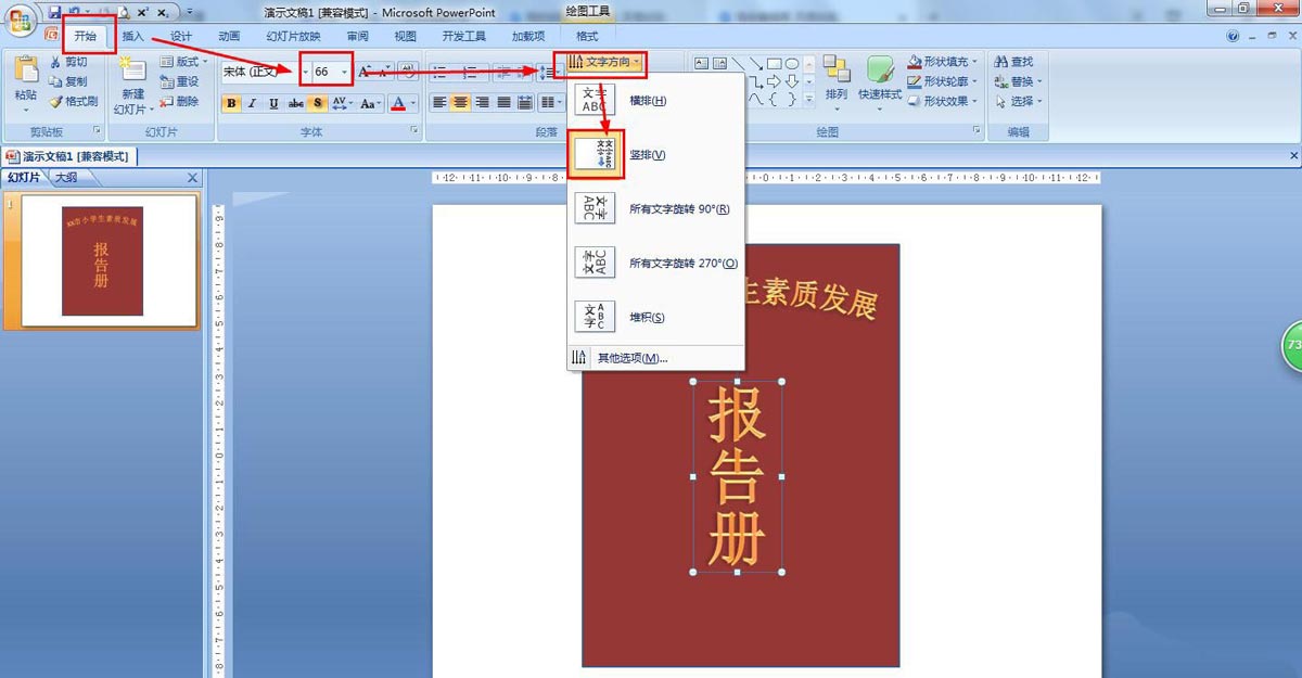 最后,点击开始——设置字体大小为66——文字方向设置为竖排。