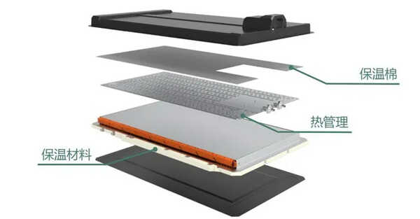 电池包从上到下内部分布为保温棉、热管理模块、保温材料等,外面则是电池壳体。内部还夹带水冷散热板、支撑电池的强度机构等。