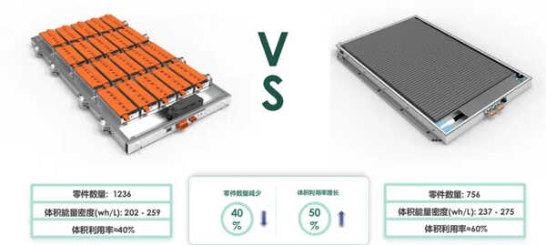 传统采用的是圆柱型状的单体电池,堆叠之后会形成较多的空隙,再除开支撑冷却以及支撑构件,最后空间利用率仅能达到40%多。扁平化的刀片电池可以缩小单体电池间的无效空隙,面积的增大对于散热也起到非常大的作用。整体排列之后,刀片电池的空间利用高达60%。