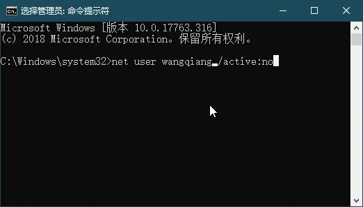 注意在实际使用时,上述命令中的<username>要用希望停用的账户名替代(例如本例为wangqiang)。