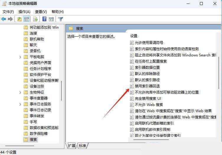 3、然后,在搜索文件中,找到并点击打开其中的“禁用索引器回退”设置。