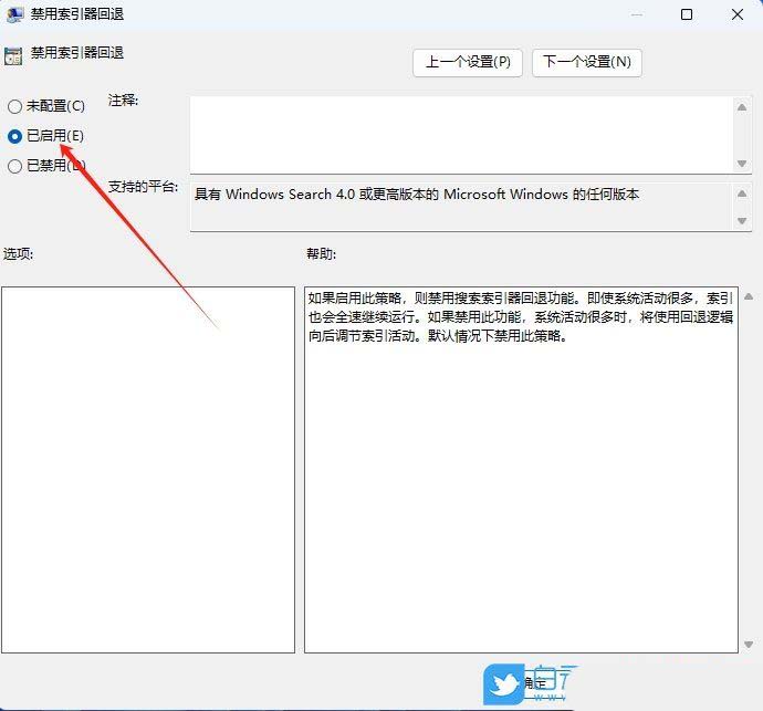 3、然后,找到并点击打开其中的“禁用索引器回退”设置。