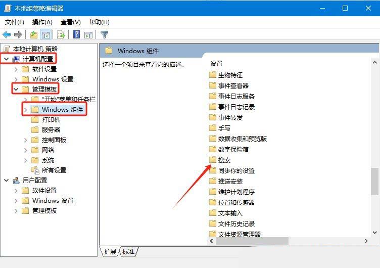 2、接着,在打开的界面中,依次点击展开“计算机配置管理模板Windows 组件搜索”。