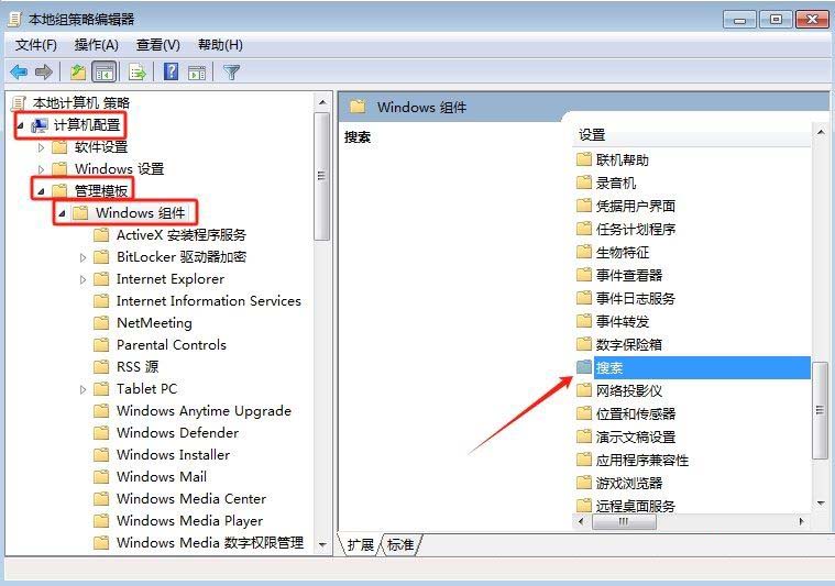 2、接着,在打开的组策略界面中,依次点击展开“计算机配置管理模板Windows组件搜索”文件。