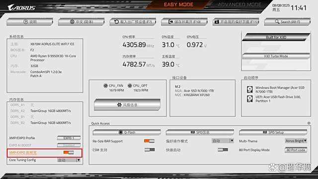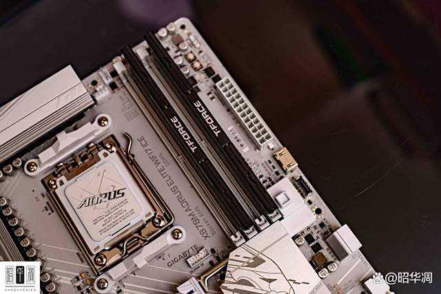 ▼上机视角,搭配测试的主板是技嘉X870M AORUSELITE WIFI7 ICE。作为一款兼顾了出色工业设计与强大性能的 AMD 平台产品,其优秀的供电和内存支持能力,使其成为检验这款高频 DDR5 内存潜力的理想载体。