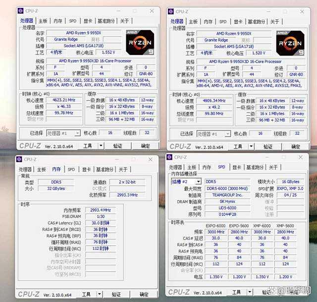 ▼首先看看 CPU-Z 的信息读取。处理器是刚发售的 AMD 锐龙9 9950X3D ,主板是技嘉X870M AORUSELITE WIFI7 ICE,内存颗粒来自当前最受欢迎的 SK 海力士,25 年第 4 周下线, 内存支持 AMD EXPO 和 Intel XMP 3.0 技术。