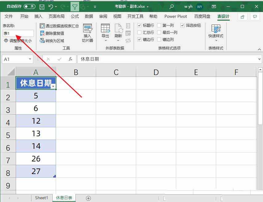这个辅助表其实就是一列数据,我们可以新建一个sheet,然后将表头设置为休息日期,在下面输入当月的休息日期,随后按下快捷键Ctrl+T将普通表转换为超级表即可,我们还需要记得这个超级表的名称,可以在【表设计】功能组下找到表名称,默认是表1