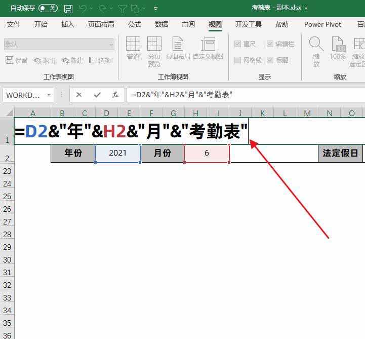 我们在D2这个单元格中输入年份2021,然后在H2这个单元格中输入月份6,我们需要根据这两个数据来构建表头和当月的日期