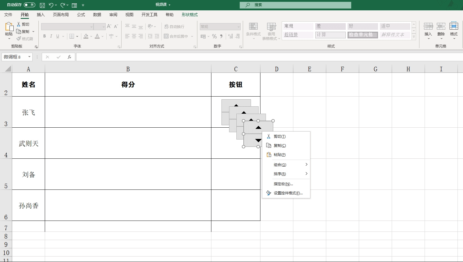 随后我们将最上面的按钮放在最后一个单元格中,然后将最下面的按钮放在第一个单元格中,随后按Ctrl+a选择所有的数值调节按钮,在形状格式中找到对齐,先选择纵向分布,然后选择左对齐,放在合适的位置即可