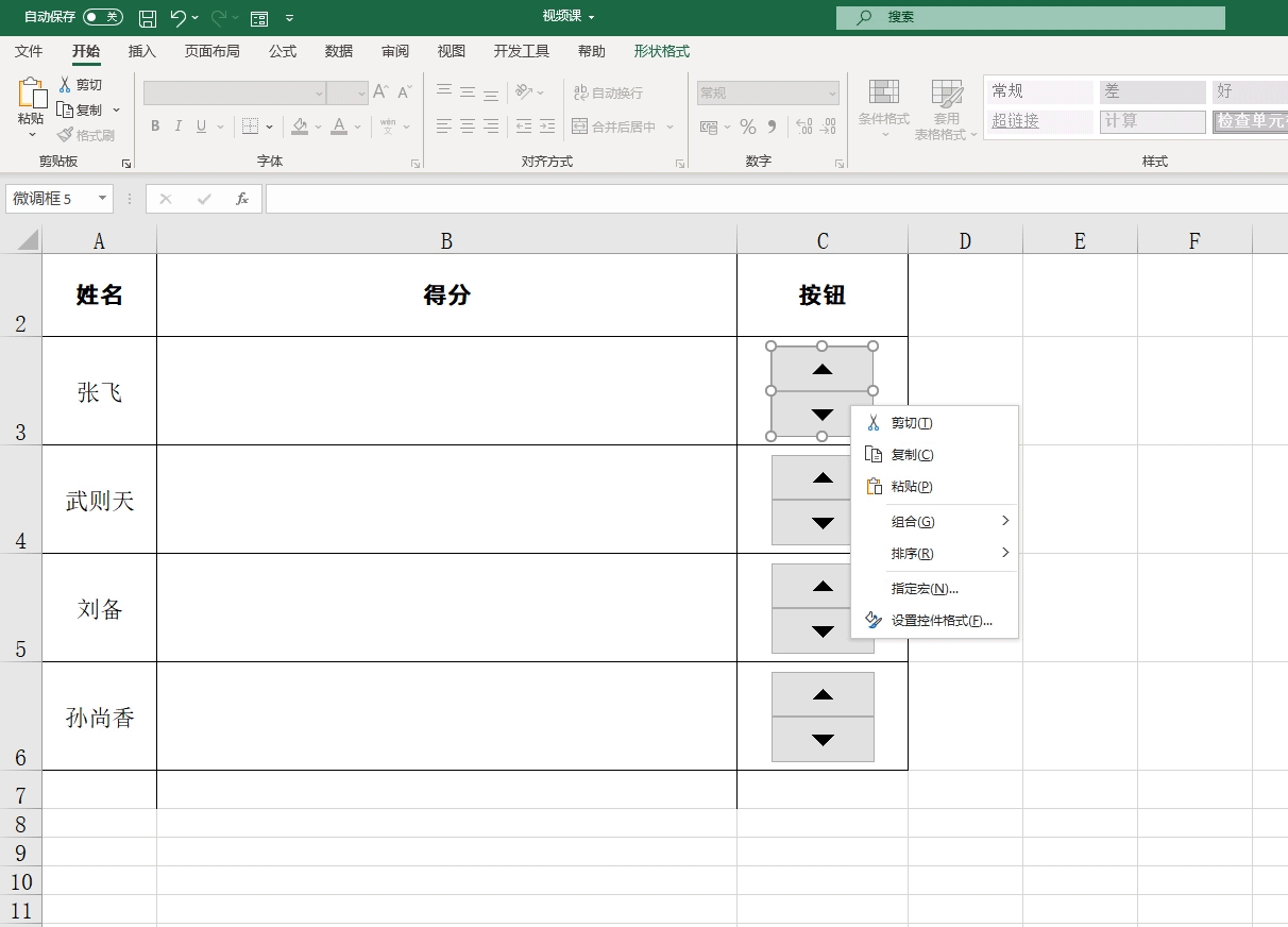 我们选择第一个数值调节按钮,点击鼠标右键选择设置控件格式,将单元格连接设置为张飞对应的单元格就是b3单元格,然后将当前值设置为0,步长设置为1其余的保持默认即可点击确认,至此一个设置完毕,以此类推之后的三个都需要这么设置