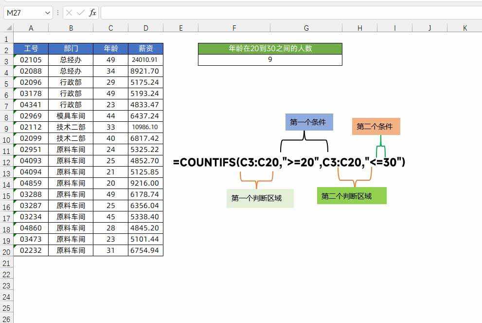 比如现在,我们想要在下图中统计下【20-30】岁之间的员工这个,这个【20-30】它就是一个区间,我们完全可以将这个区间拆分为2个条件,然后根据这2个条件进行多条件计数即可