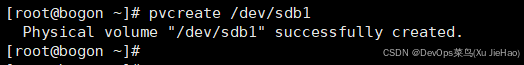 分区建好了,为了让之后的LVM可以使用到这个分区,我们需要在新的分区 /dev/sdb1 上创建物理卷PV。