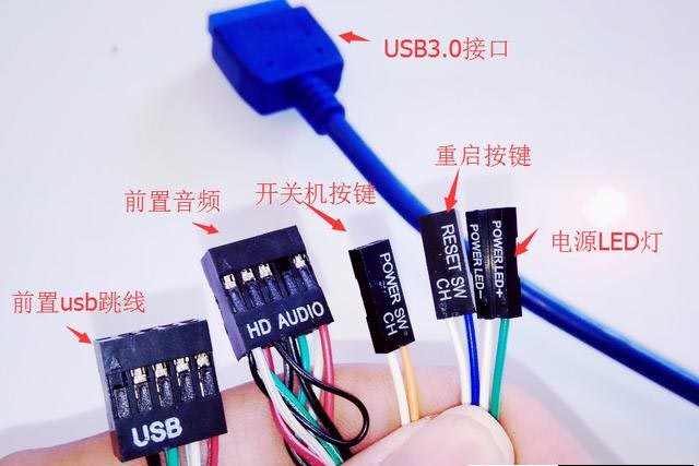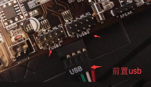 再来插入前置USB接口和前置音频接口,这些接口也是有防呆设计的,因此如果错了是无法插入的,首先先插USB接口,USB标识的接口对应主板上的USB标识接口上。