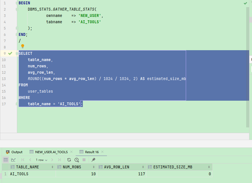 BEGINDBMS_STATS.GATHER_TABLE_STATS(ownname =>'NEW_USER',tabname =>'AI_TOOLS');END;/SELECTtable_name,num_rows,avg_row_len,ROUND((num_rows * avg_row_len) / 1024 / 1024, 2)ASestimated_size_mbFROMuser_tablesWHEREtable_name ='AI_TOOLS';
