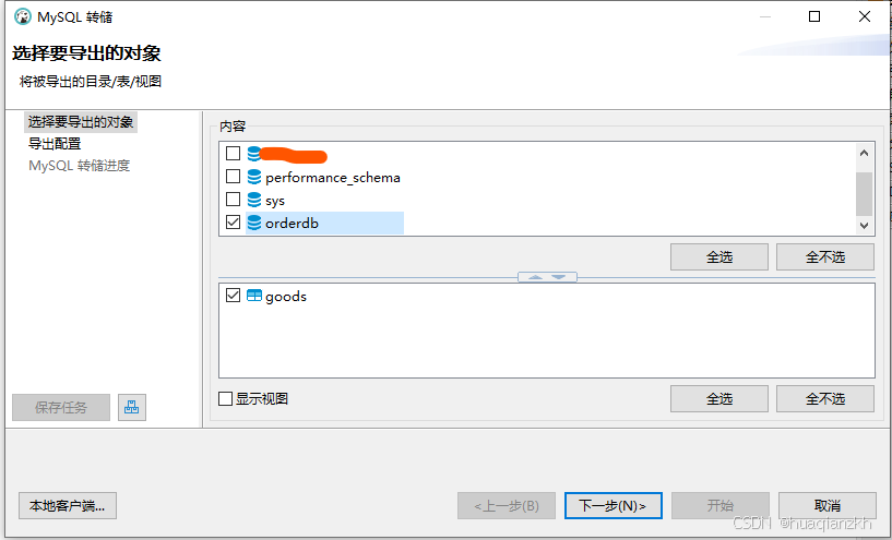 在弹出的“转储数据库”对话框中,选择要备份的数据库和表格。默认情况下,所有表格都会被选中。用户可以根据需要取消某些表格的选择。此外,还可以配置一些转储选项,例如是否包含表结构、数据、视图、存储过程等。
